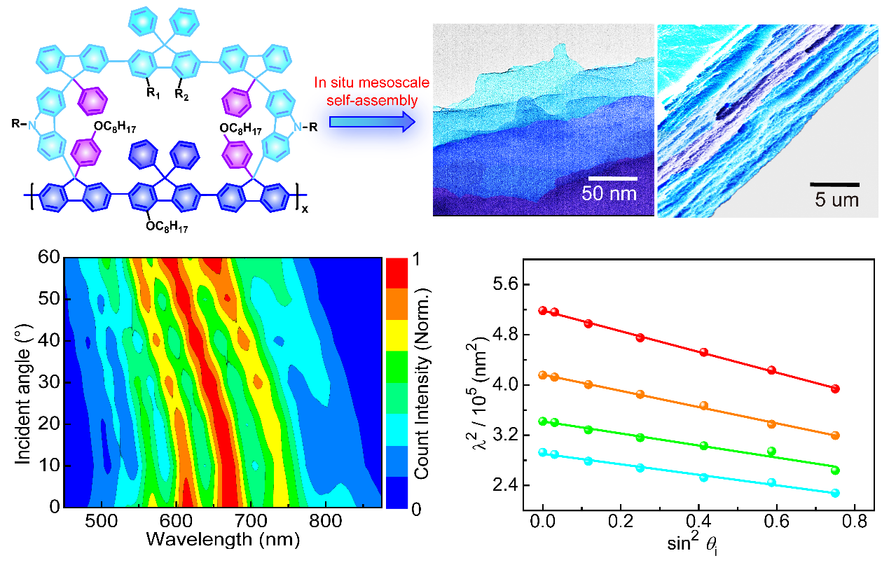 图二、共轭聚格的介观组装形貌及其角分辨反射谱
