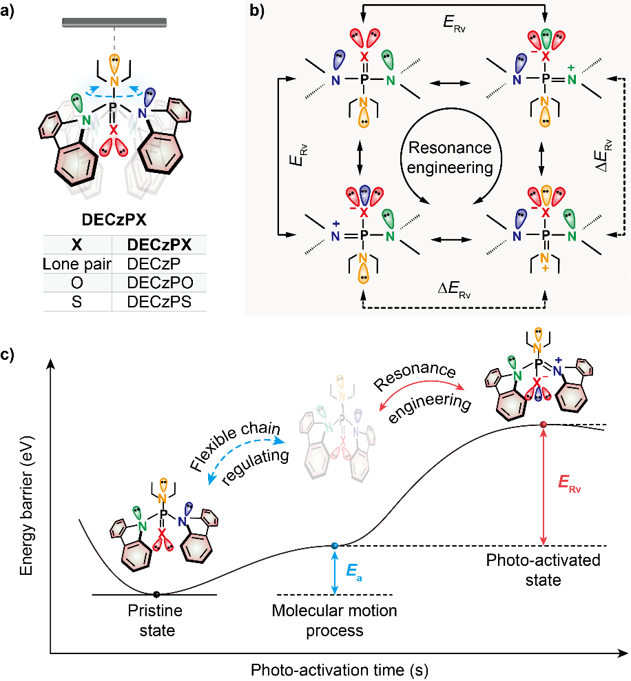 针对这一难题,南京邮电大学陈润锋教授和黄维院士团队在前期对于动态共振有机光电材料的研究基础之上,发现共振活化能是调控三线态激子产生速率的关键参数,提出利用共振工程构建有机超长室温磷光材料刺激响应能力的调制策略,建立了衡量材料光活化能力的量化参数。利用柔性共振结构与磷光发色团结构,通过光驱动的柔性烷基链实现分子聚集态的调控;进一步的,通过共振工程有效地调节材料体系的共振活化能,从而调控其相应的三线态激子产生速率,开发具有可调制动态光响应行为的有机超长室温磷光材料体系。该类共振诱导的刺激响应性有机长余辉材料体系展现出明显的光活化现象,其发光寿命从~40 ms提高到了720 ms,发光效率由1.54%提高到了5.1%,并且表现出可控的光活化速率,随着共振活化能的增加,其光活化速率逐渐降低,在功率密度为0.5 mW/cm2时,其光活化速率可以由0.48 min -1减小到0.31 min -1。