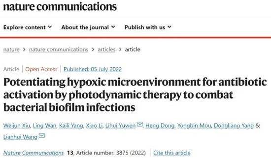 近日,南京邮电大学汪联辉教授和宇文力辉副教授团队与南京工业大学杨栋梁博士、南京大学医学院附属口腔医院牟永斌教授开展合作研究,在细菌生物膜感染治疗领域取得重要进展,提出通过增强乏氧微环境调控细菌代谢并激活药物的新型高效治疗策略。相关成果以Potentiating hypoxic microenvironment for antibiotic activation by photodynamic therapy to combat bacterial biofilm infections为题发表在国际顶级学术期刊Nature Communications(《自然·通讯》)上。