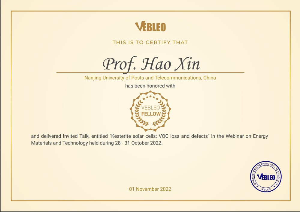 辛颢教授长期致力于光电功能材料及应用研究。以第一作者或通讯作者身份在Nature Energy、Energy & Environmental Science、Journal of American Chemical Society等国内外刊物发表SCI论文70余篇,授权专利十余项。辛颢教授此次获得Vebleo Fellow荣誉称号,标志着我院在薄膜太阳能电池领域的科研工作获得国内外同行的高度认可,进一步提升了我院的国际影响力。
