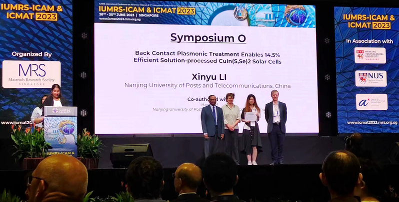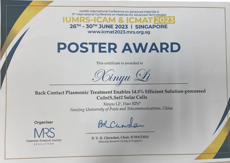 辛颢教授被大会邀请作了题目为《The origin of VOC-deficitof Kesterite Solar Cells》的学术报告,此外,辛颢教授团队的2021级硕士研究生潘翔宇、袁明君在会议上进行口头报告,报告题目分别为《12.3% Efficient Pure Sulfide Kesterite Solar Cells from DMSO Solution Via Cadmium Alloying》和《Kesterite Modules with Efficiency Over 4%》;2021级博士研究生李新毓、马乘风分别提交了题目为《Back contact plasma treatment enables 14.5% efficient solution-processed CuIn(S,Se)2 solar cells》和《High efficient Cu(In,Ga) (S,Se)2 thin film solar cells via doctor-blading DMF precursor solution》的墙报。经过专家评比,李新毓同学获得优秀墙报奖。