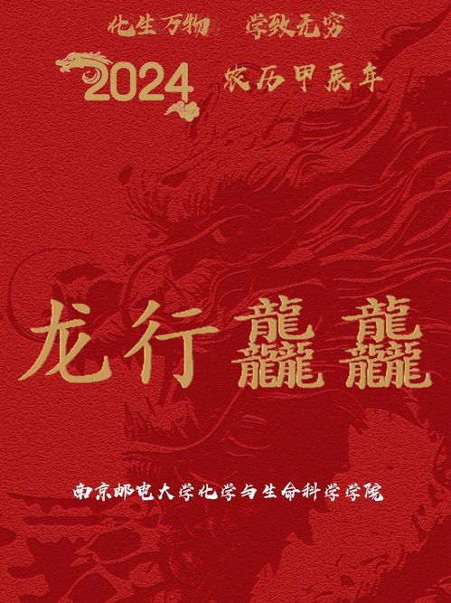 红包顶部印有学院的口号“化生万物,学致无穷”,这不仅是对化学与生命科学领域探索精神的体现,也是对学院师生们勇于探索、不断创新的鼓励和期许。上部巧妙融合了2024甲辰龙年的元素,将龙的形象图与“2024”这个数字相结合,形成了一幅充满创意和动感的画面。中部印有祝福语“龙年龘龘、前程朤朤、生活䲜䲜”,通过生动的叠词和形象的描绘,传达了学院对师生们龙年事业有成、前程似锦、生活幸福美满的真诚祝愿。这些祝福语不仅体现了学院对师生个人发展的关心和关注,也激发了人们对新年的期待和对美好未来的憧憬。