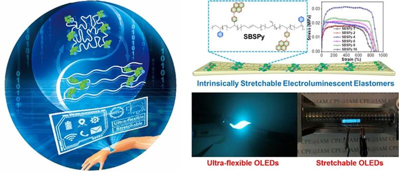 近年来,柔性可拉伸电子器件领域迅速发展,成为重要的研究方向。拉伸发光显示器件作为其中的重要组成部分,是整个可拉伸电子系统的信息输出窗口。为了实现高效可拉伸发光器件制备,该团队提出了一种基于纳米自限域效应的本征拉伸发光材料设计策略,该策略平衡了材料力学、光学和电学性能,基于该材料制备的可拉伸OLEDs打破了非共混可拉伸发光器件的最高效率记录。这一研究为新型可拉伸电致发光材料及高效可拉伸显示与智能光电领域的应用做出了重要贡献,推动了拉伸显示器件在可穿戴电子设备、人机动态交互和软机器人等领域的应用。
