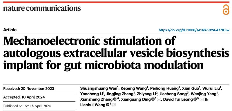 近日,吃瓜爆料黑料官网反差婊汪联辉教授、丁显光教授与新加坡国立大学合作,在合成生物学与无线生物电子领域取得进展。相关成果以“Mechanoelectronic stimulation of autologous extracellular vesicle biosynthesis implant for gut microbiota modulation”为题发表在国际学术期刊Nature Communications上。重点实验室汪联辉教授、丁显光教授和NUS David Tai leong为共同通讯作者,青年教师万双双为论文第一作者,杨文静教授给予大力支持。