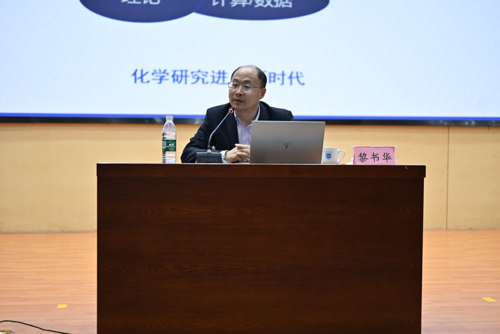 黎书华教授系统阐述了理论化学和计算化学的内涵,强调理论和计算化学正在推动化学学科的变革性发展。黎教授分享了本课题组以及国内外在该领域的研究进展和发展趋势,重点介绍量子化学和分子模拟方法在理解分子结构、化学反应机理、生物和材料体系的结构和性质等方面的应用,并简要介绍其在推动合成化学、催化化学等领域发展的一些典型示例。在互动环节,黎教授对学生的提问进行了耐心解答,与学生展开亲切的交流讨论。