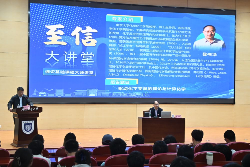 2024年4月24日,“至信大讲堂”通识基础大师讲堂第五期在我校图书馆四楼报告厅举行。南京大学化学化工学院院长,博士生导师,国家杰出青年基金获得者,教育部“长江学者”特聘教授黎书华作题为“驱动化学变革的理论与计算化学”专题报告。我校教务处、化学与生命科学学院领导出席讲堂。化学与生命科学学院2023级学生线下参会,全校2023级学生以线上方式聆听专家报告。