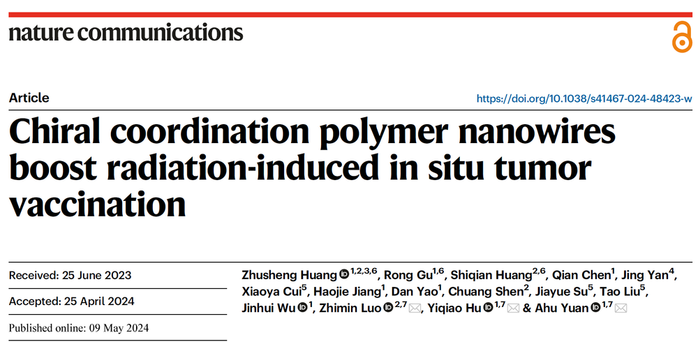 近日,吃瓜爆料黑料官网反差婊罗志敏教授与南京大学合作,在手性纳米佐剂与肿瘤原位疫苗领域取得最新研究进展。相关成果以“Chiral coordination polymer nanowires boost radiation-induced in situ tumor vaccination”为题发表在国际学术期刊Nature Communications上。重点实验室罗志敏教授和南京大学胡一桥教授、袁阿虎教授为共同通讯作者,青年教师黄竹胜和硕士研究生顾榕、黄世前同学为论文的共同第一作者,清华大学崔晓亚博士、苏家跃博士和冷冻电镜平台刘涛老师给予了冷冻透射电镜表征和结构解析的大力支持。