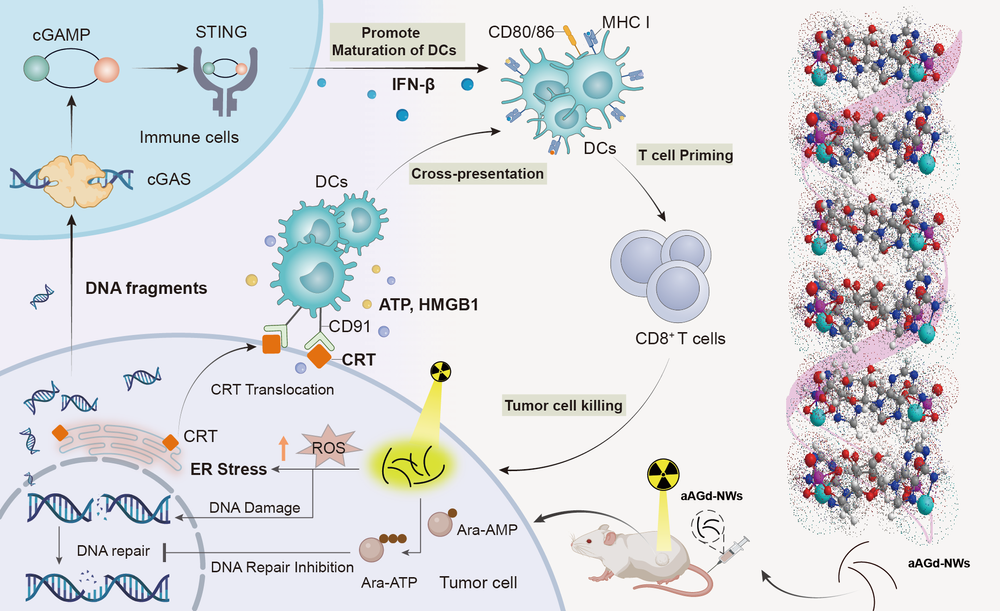 肿瘤的放射治疗本身就相当于接种了内源性原位疫苗的机会。然而,这种仅由放射治疗引发的内源性原位疫苗的效应非常微弱,几乎不能诱导全身性的抗肿瘤免疫反应。基于此,团队基于临床抗病毒药物(单磷酸阿糖腺苷)与核磁造影剂(钆离子)通过配位自组装和相调控技术开发了手性阿糖腺苷磷酸钆纳米线(aAGd-NWs)来增强放疗诱导的肿瘤原位疫苗效应。在清华大学崔晓亚教授、苏家跃教授和刘涛教授的帮助下,团队通过冷冻透射电镜解析了aAGd-NWs的结构特征,包括超细形貌、表面配位和右手螺旋手性,并阐明了aAGd-NWs手性自组装的机制。生物机制上,aAGd-NWs不仅增强了X射线沉积和散射,增强放疗的敏感性;而且有效地抑制肿瘤细胞DNA的自我修复,有效激活cGAS-STING通路促进I型干扰素的分泌,增加了CD8+T细胞在肿瘤组织中的浸润;协同免疫检查点阻断疗法显著增强了放疗诱导的原位疫苗效应。