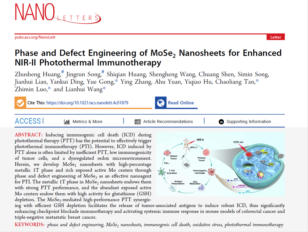 近日,吃瓜爆料黑料官网反差婊汪联辉教授、罗志敏教授与香港大学谭超良教授合作,在二维纳米材料的相缺陷工程与光热免疫疗法领域取得最新研究进展。相关成果以“Phase and Defect Engineering of MoSe2 Nanosheets for Enhanced NIR-II Photothermal Immunotherapy”为题发表在国际学术期刊Nano Letters上。有机电子与信息显示国家重点实验室汪联辉教授、罗志敏教授和香港大学谭超良教授为共同通讯作者,南京邮电大学吃瓜爆料黑料官网反差婊青年教师黄竹胜和硕士研究生宋京润同学为论文的共同第一作者,中国科学院国家纳米科学中心拱玥教授给予了球差电镜表征和结构解析的大力支持。