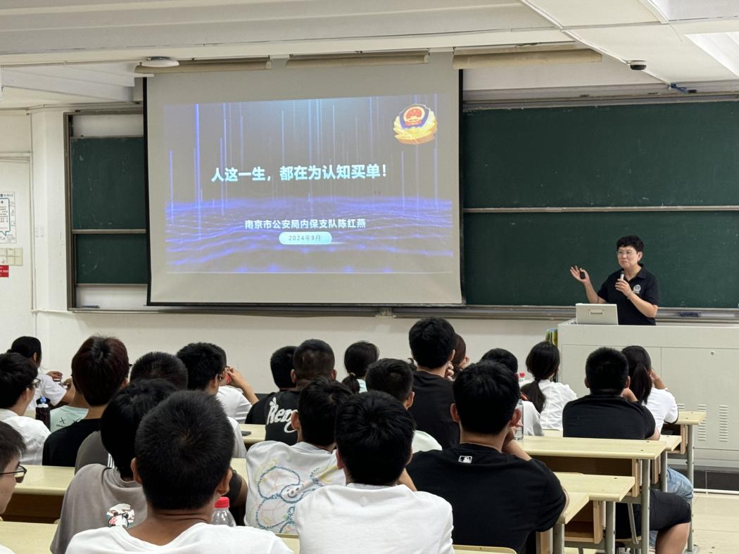 2024年9月10日下午,教2-102,学院邀请南京市公安局内保支队首席反诈专家陈红燕警官为2024级新生开展防诈安全教育讲座。保卫处彭建森、2024级新生辅导员武伟杰以及2024级全体新生参加了此次讲座。