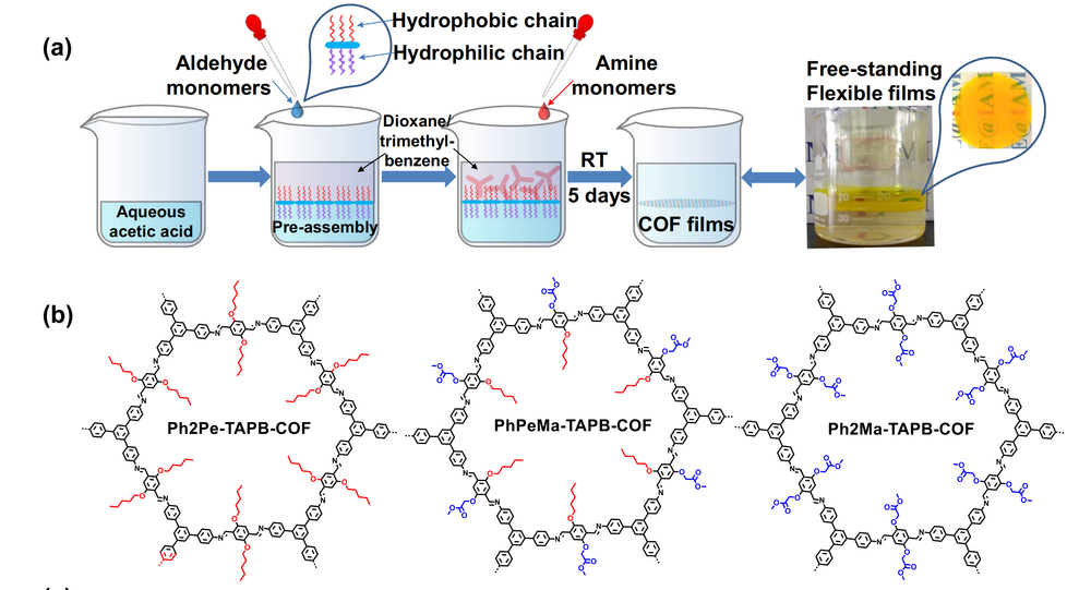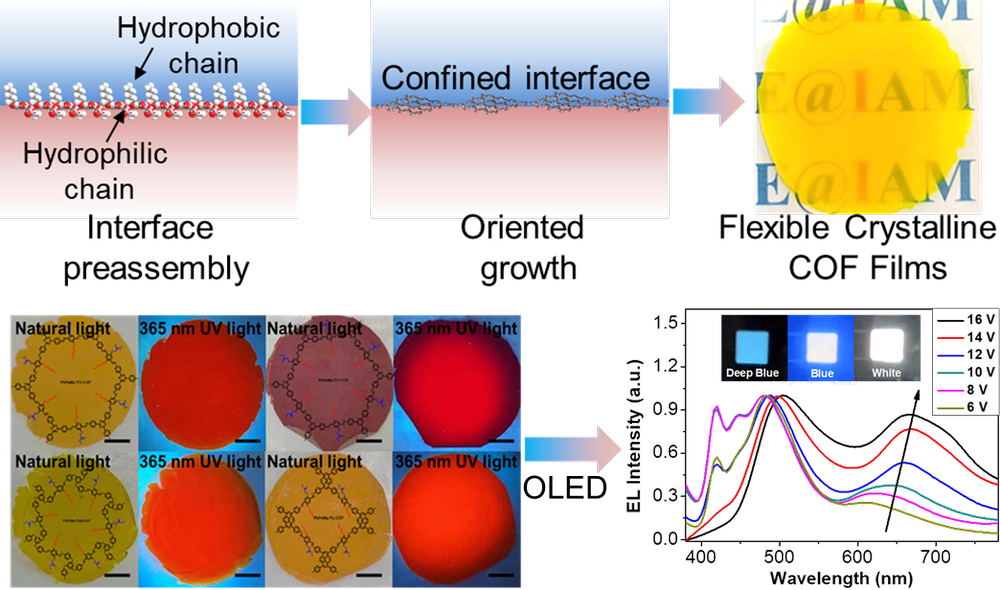 该工作从分子工程角度揭示了亲疏水作用调控材料微纳结构的机制,为设计兼具高结晶度与高柔韧性的光电功能薄膜材料奠定了理论基础。界面预组装定向生长策略展现的“结构-性能”精准调控能力,为开发兼具类皮肤柔性和半导体性能的电子材料开辟了新路径。目前,团队正进一步探索COF材料的电荷传输机制与器件界面优化,以期推动其在柔性显示、柔性传感、仿生电子等领域的深度应用。