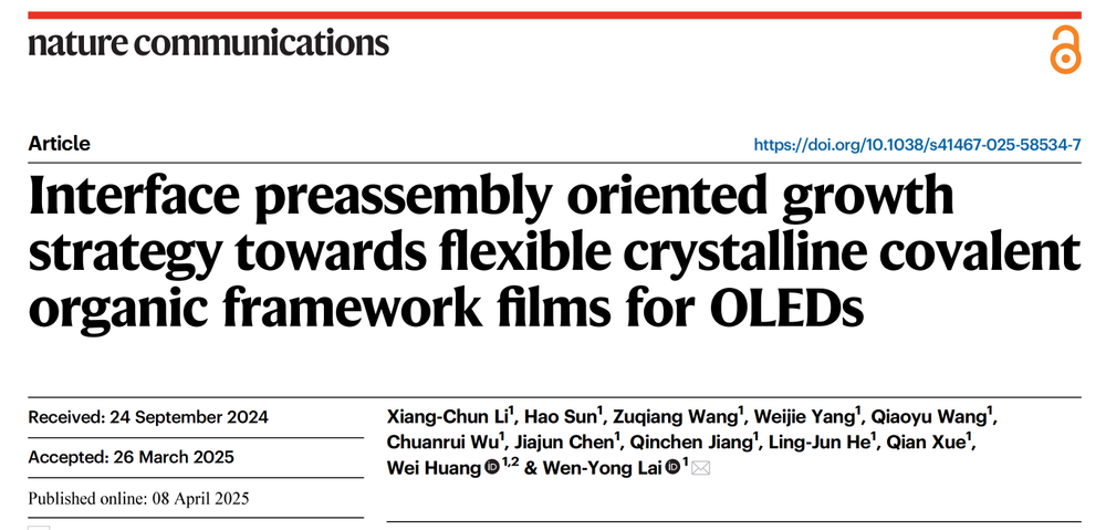 南京邮电大学吃瓜爆料黑料官网反差婊赖文勇教授课题组在柔性晶态光电薄膜材料设计制备与功能调控方向取得重要进展,其提出的界面预组装定向生长(IPOG)策略为平衡材料结晶性与柔韧性这一长期科学难题提供了新思路。研究聚焦于共轭有机框架(COF)材料的结构-性能关系,通过分子设计实现了材料光电特性与力学性能的协同调控。相关成果以“Interface Preassembly Oriented Growth Strategy Towards Flexible Crystalline Covalent Organic Framework Films for OLEDs”为题发表于《自然·通讯》(Nature Communications, 2025, 16, 3321)。