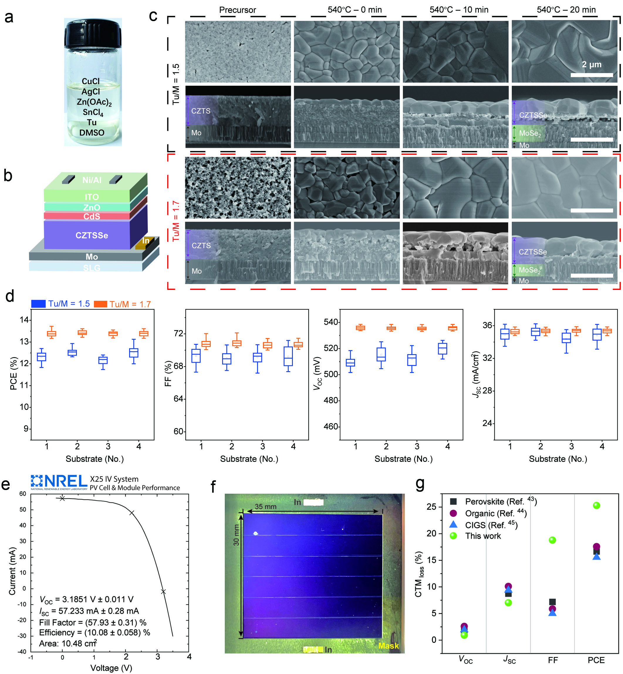 (a) 前驱体溶液照片,(b) CZTSSe太阳能电池结构示意图,(c) 不同组分溶液(Tu1.5,Tu1.7)制备的前驱薄膜与吸收层薄膜在不同硒化阶段的表面及截面SEM图像,(d) Tu1.5与Tu1.7太阳能电池光伏参数统计图,(e) 经NREL认证的效率为10.08%的CZTSSe组件I-V曲线图,(f) 认证组件正面照片,(g) 薄膜太阳能电池组件(钙钛矿、有机、铜铟镓硒(CIGS)、CZTSSe组件)CTM(Cell to Module)损失对比。
