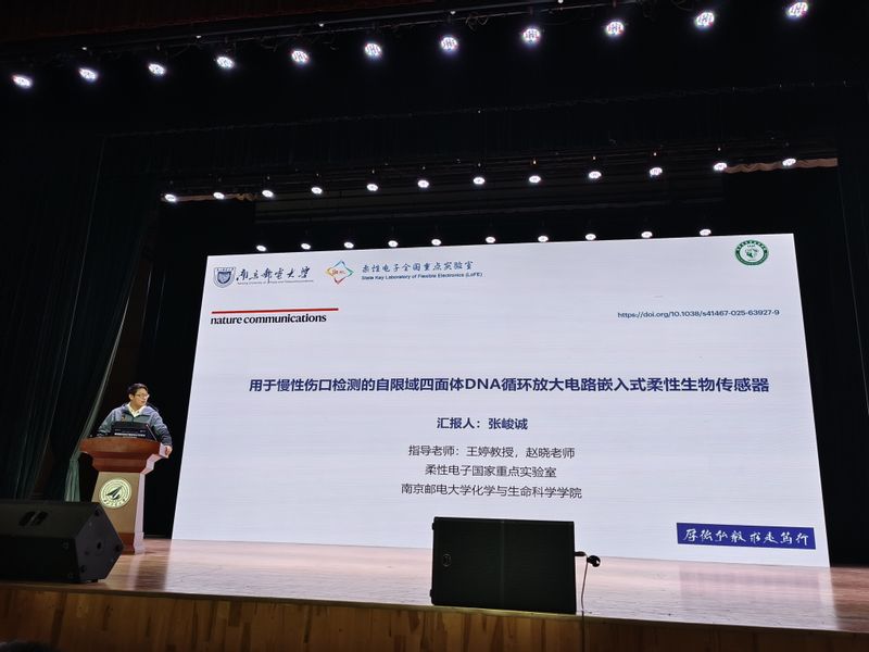 学院硕士研究生张峻诚在学术论坛上作了题为《用于慢性伤口检测的自限域四面体DNA循环放大电路嵌入式柔性生物传感器》的汇报。该报告聚焦于面向慢性伤口管理的柔性生物电子技术,开发了一种嵌入自限域四面体DNA电路的智能传感贴片,能够对伤口微环境中TNF-α、IL-6、TGF-β、VEGF等多种关键蛋白标志物进行原位、高保真的动态监测。报告内容系统深入,展现了扎实的研究基础与良好的学术素养,得到了与会专家和师生的广泛关注与积极评价。